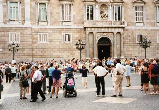 On Sunday evenings a Sardana dance accompanied by an orchester takes place on the square in front of the Palau de la Generalitat.The Sardana is the traditional dance of the Catalans. When the music starts the people (from 18 to 80) put their bags on the ground in the middle of the circle, which takes form. They grab the hands of their neighbours and start to dance.The musical pieces change during the dance, but not the sequence of the paces, which is starting new time after time. Within the sequence slow paces change with fast paces, but the dancer don’t move in circles. The faces of the dancers are staying serious and concentrated. My guide book is telling, that the difficulty of the paces is supposed be the reason for this seriousness. Maybe, however, it is simply because the Catalans take this dance, which shall symbolize the bond of the people, seriously.Though the Catalans have nothing against foreigners taking part in their dance, we stayed in a safety distance for the dance didn’t look just easy.